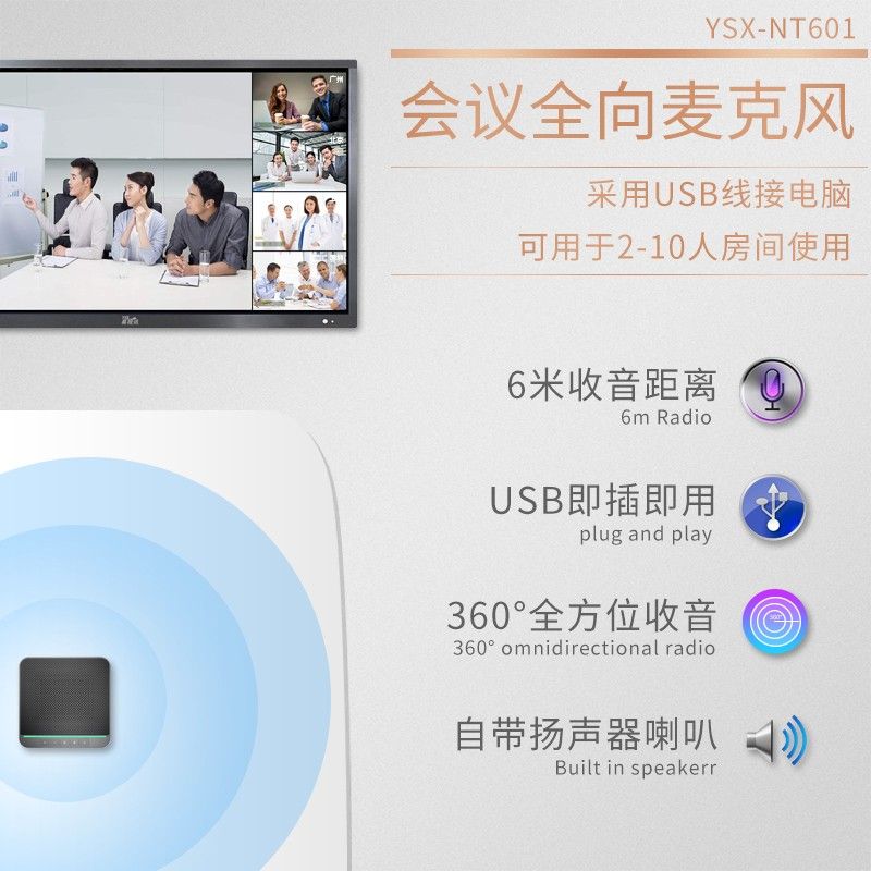 易视讯YSX-NT601视频会议全向麦克风(适用10-30㎡视频会议室拾音6米)桌面扬声器
