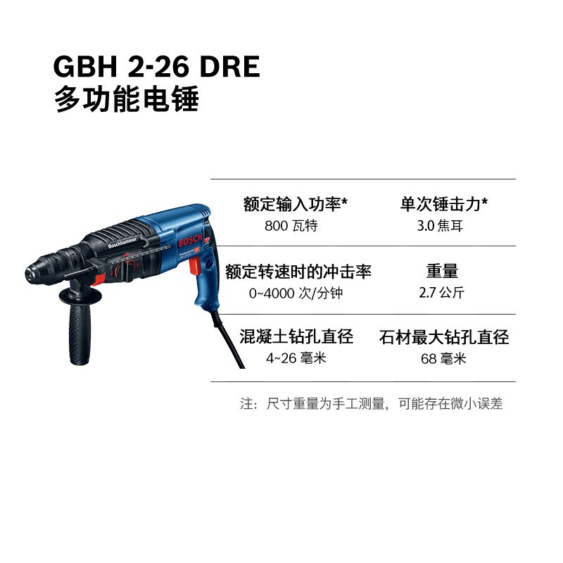 博世(BOSCH)GBH 2-26 DRE 轻型电锤电钻电镐 800瓦插电式多功能四坑电锤工具箱 工业级