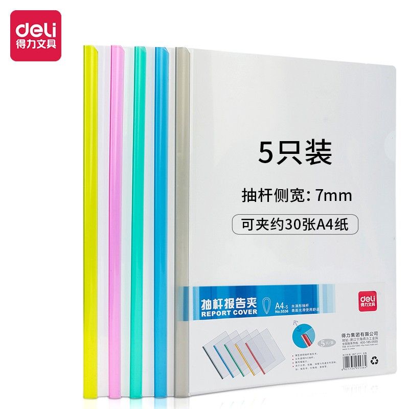 得力(deli)5只A4水滴形拉杆夹 彩色抽杆学生考试产检报告资料收纳 5色装5536